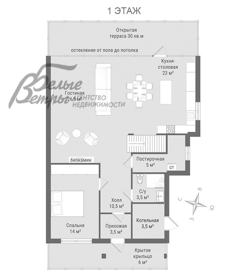 1-ый этаж: крытое крыльцо 6 кв.м, прихожая 3,5 кв.м, холл 10,5 кв.м, гостиная 26,5 кв.м, кухня-столовая 23 кв.м с выходом на открытую террасу 30 кв.м, спальня (гостевая) 14 кв.м, санузел 3,5 кв.м, постирочная 5 кв.м, котельная 3,5 кв.м
