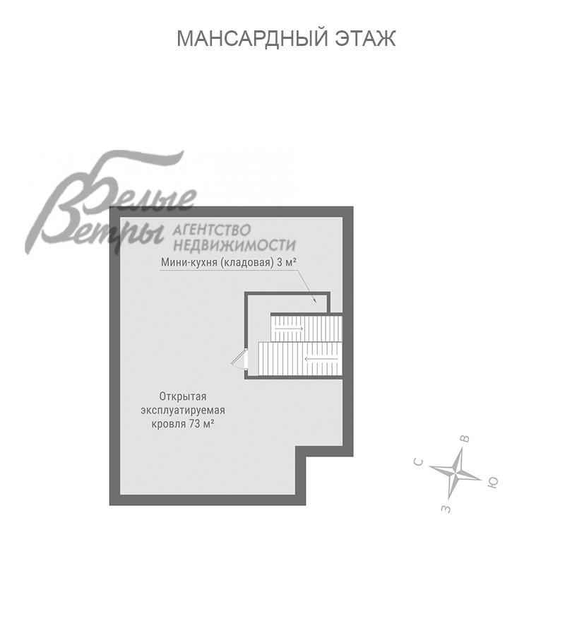 3-ий этаж: мансардный этаж: тёплый тамбур, открытая эксплуатируемая кровля 73 кв.м, мини-кухня (кладовая) 3 кв.м