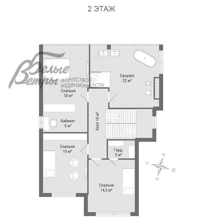 2-ой этаж: холл 16 кв.м, спальня 18 кв.м с кабинетом (гардеробной) 5 кв.м, спальня 16 кв.м, спальня 14,5 кв.м с гардеробной 3 кв.м, санузел с ванной и душем 22 кв.м